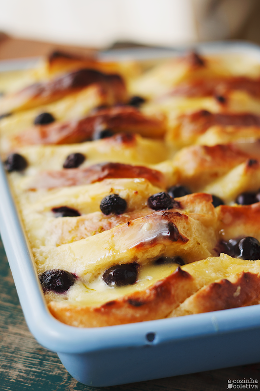 Semana passada, quando preparei minha primeira Challah [um pão tradicional judaico parecido com a nossa rosca simples - em breve posto a receita aqui], tratei de guardar um bom pedaço para transformar em pudim de pão - a textura macia de sabor bem neutro parecia ideal para isso! Puxei essa receita dos meus favoritos - faz tempo que eu estava ensaiando para testar - e em cinco minutinhos fiz meia receita de curd fresquinho. Besuntei bem as fatias de pão com manteiga e bastante curd, montei no refratário, espalhei uns mirtilos que eu tinha congelado e fiz o creme - aliás, meu creme levou mais açúcar que o da receita original, gosto pessoal mesmo [até porque minha receita de curd é pouco doce, bem azedinha]. Afoguei bem as fatias de pão no creme antes de levar ao forno e deixei descansar uns minutinhos. Depois foi só esperar assar e pronto, uma travessa cheia de pudim de pão cítrico, dourado e fumegante! Claro que ninguém nem esperou amornar.