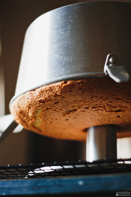 Retire do forno e imediatamente vire a fôrma de cabeça para baixo, com o tubo do meio apoioado sobre o fundo de um copo ou sobre o apoio metálico que normalmente vem com a fôrma de bolo chiffon [como na foto]. Deixe esfriar completamente assim, de ponta cabeça, por pelo menos 1 hora e meia [eu sempre preparo o bolo antes de dormir e deixo assim durante a noite].